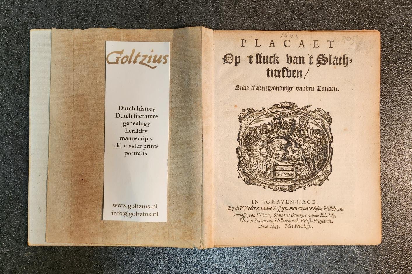 Placaet op 't stuck van 't slachturfven ende d'ontgrondinge vanden landen. The Hague ('sGraven-Hage), By de Weduwe, ende Erffgenamen van wijlen Hillebrant Iacobssz van Wouw (...), 1643, 4to., green marbled paper binding, [14] pp., binding torn along the spine, the discoloured flyleaves, wooduct printer's mark on titlepage depicting the herladic lion of the Low Countries, with a decorative initial. A government decree concerning the prohibition of using fertile land to create, in Dutch: "turf", a fuel.