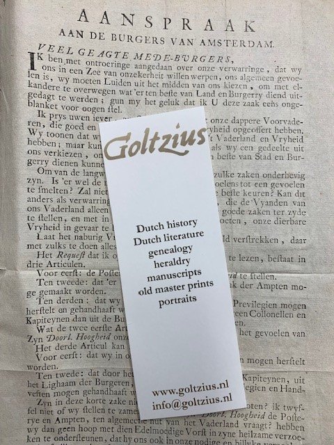 | Meer info: | Aanspraak aan de Burgers van Amsterdam. [Amsterdam], 10 Augustus 1748, one printed page, 30,5x18,5cm. Pamphlet written in the unruly year 1748 when Dutch citizens turned against the elite and demanded fairer taxation and more help from stadhouder Willem IV. Scarce. |
