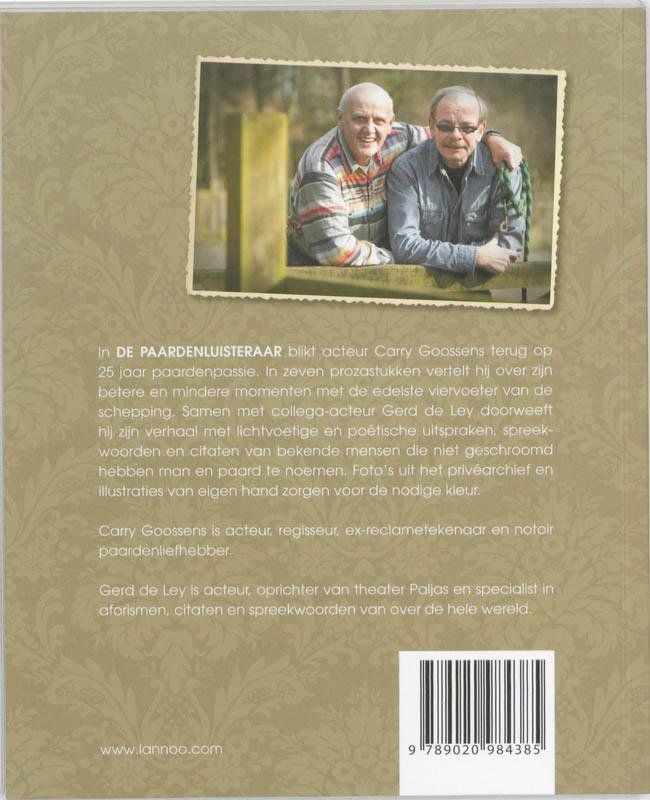 Carry Goossens deelt zijn passie Acteur Carry Goossens blikt terug op 25 jaar paardenpassie. In zeven prozastukken vertelt hij over zijn betere en mindere momenten met de edelste viervoeter van de schepping. Het verhaal is doorweven met lichtvoetige en poëtische uitspraken, spreekwoorden en citaten van bekende mensen die niet geschroomd hebben man en paard te noemen. Met foto's uit het privé-archief en illustraties van de auteur zelfIn DE PAARDENLUISTERAAR blikt acteur Carry Goossens terug op 25 jaar paardenpassie. In zeven prozastukken vertelt hij over zijn betere en mindere momenten met de edelste viervoeter van de schepping. Samen met collega-acteur Gerd de Ley doorweeft hij zijn verhaal met lichtvoetige en poëtische uitspraken, spreekwoorden en citaten van bekende mensen die niet geschroomd hebben man en paard te noemen. Foto's uit het privéarchief en illustraties van eigen hand zorgen voor de nodige kleur.