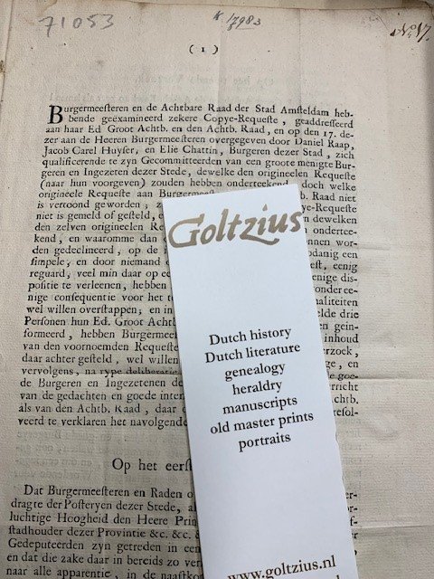 Burgemeesteren en de Achtbare Raad der Stad Amsteldam hebbende geexamineerd zekere Copye-Requeste (...) Amsterdam, 19 Augustus 1748, 3 pages printed text, no binding, Pamphlet written by the city of Amsterdam in reaction to a request by the citizens Daniel Raap and others concerning freedom and the stadhouder (in three articles), in the unruly year 1748 when Dutch citizens turned against the elite and demanded fairer taxation and more help from stadhouder Willem IV. Signed by J. van Loon de Jonge. Knuttel 17983. Scarce. Not in KB.