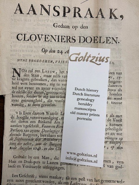 Aanspraak, Gedaan op den Cloveniers Doelen. Gedaan op den 24 Augustus 1748. Myne broederen, vrienden en landgenooten. Amsterdam, J. den Eurm, 1748, 8pp. no binding, edges frayed, center cut out. 31x20cm. Pamphlet written in the unruly year 1748 when Dutch citizens turned against the elite and demanded fairer taxation and more help from stadhouder Willem IV. Knuttel 17991. Scarce.