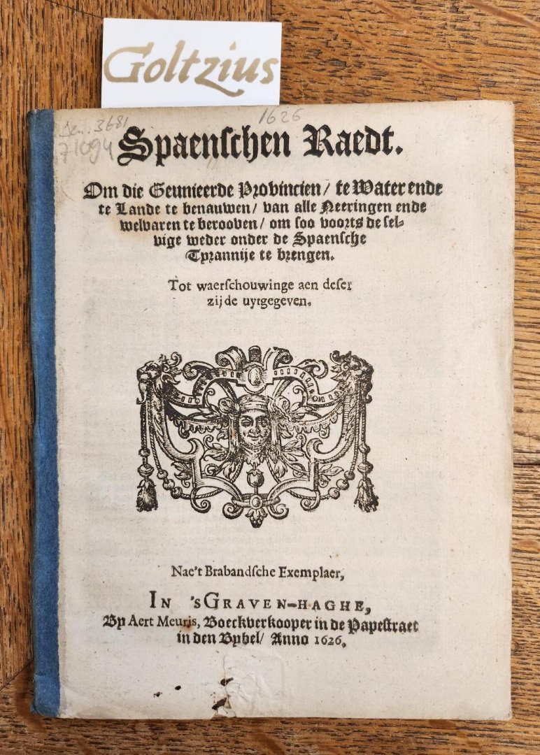Spaenschen raedt. Om die Geunieerde Provincien, te water ende te lande te benauwen, van alle Neeringen ende welvaren te berooven, om soo voorts de selvige weder onder de Spaensche Tyrannije te brengen. Tot waerschouwinge aen deser zijde uytgegeven. Nae't Brabandsche Exemplaer. The Hague ('sGraven-Hage), Aert Meuris, 1626, 4to., without binding, just a strip of blue paper covering the spine, small tear at te bottom of the titlepage, 61 pp., with a woodcut vignet on the titlepage. A politcal pamphlet presented in the form of a conversation between two Spanish knights.