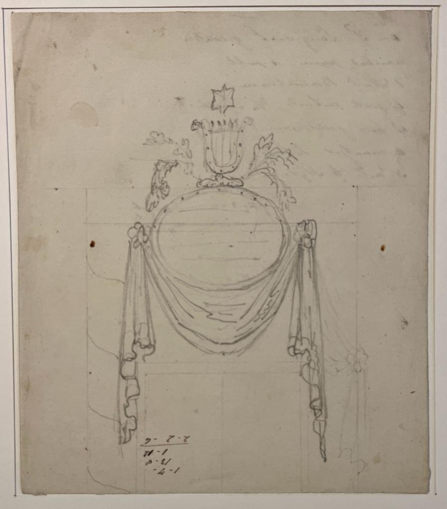 | Bijzonderheden: | Decorative piece with an oval and a cloth or curtain falling on either sides of the sketch. Horizontal lines on the oval might be a sign that it framed some text. Above the oval is a lyre, topped by a six point star. Some handwritten notes on the ... |