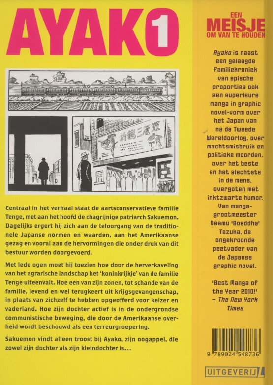 AYAKO 1 - Een meisje om van te houdenCentraal in het verhaal staat de aartsconservatieve familie Tenge, met aan het hoofd de chagrijnige patriarch Sakuemon. Dagelijks ergert hij zich aan de teloorgang van de traditionele Japanse normen en waarden, aan het Amerikaanse gezag en vooral aan de hervormingen die onder druk van dit bestuur worden doorgevoerd. Met lede ogen moet hij toezien hoe door de herverkaveling van het agrarische landschap het 'koninkrijkje' van de familie Tenge uiteenvalt. Hoe een van zijn zonen, tot schande van de familie, levend en wel terugkeert uit krijgsgevangenschap, in plaats van zichzelf te hebben opgeofferd voor keizer en vaderland. Hoe zijn dochter actief is in de ondergrondse communistische beweging, die door de Amerikaanse overheid wordt beschouwd als een terreurgroepering. Sakuemon vindt alleen troost bij Ayako, zijn oogappel, die zowel zijn dochter als zijn kleindochter is... Ayako is naast een gelaagde familiekroniek van epische proporties ook een superieure manga in graphic novel-vorm over het Japan van na de Tweede Wereldoorlog, over machtsmisbruik en politieke moorden, over het beste en het slechtste in de mens, overgoten met inktzwarte humor. Van manga-grootmeester Osamu 'Boeddha' Tezuka, de ongekroonde peetvader van de Japanse graphic novel.