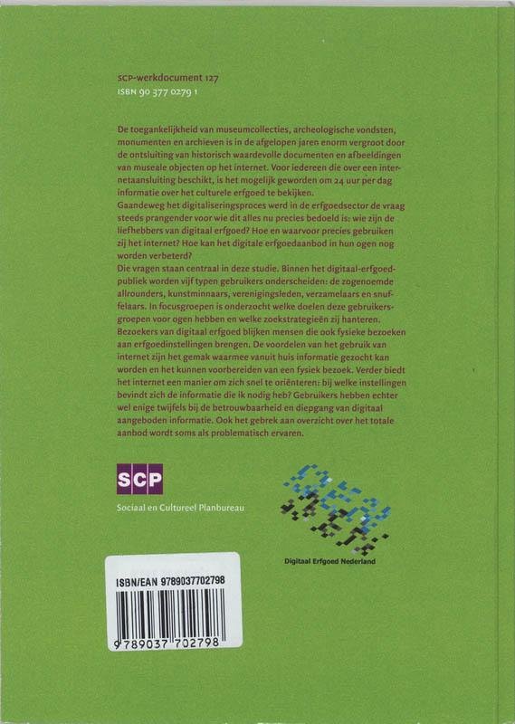SCP werkdocument 127ISBN 90 377 0279 1De toegankelijkheid van museumcollecties, archeologische vondsten, monumenten en archieven is in de afgelopen jaren enorm vergroot door de ontsluiting van historisch waardevolle documenten en afbeeldingen van museale objecten op het internet. Voor iedereen die over een inernetaansluiting beschikt, is het mogelijk geworden om 24 uur per dag informatie over het culturele erfgoed te bekijkenGaandeweg het digitaliseringsproces werd in de erfgoedsector de vraag steeds prangender voor wie dit alles nu precies bedoeld is: wie zijn de liefhebbers van digitaal erfgoed? Hoe en waarvoor precies gebruiken zij het internet? Hoe kan het digitale erfgoedaanbod in hun ogen nog worden verbeterd?Die vragen staan centraal in deze studie. Binnen het digitaal-erfgoed-publiek worden vijf typen gebruikers onderscheiden: de zogenoemde allrouders, kunstminnaars, verenigingsleden, verzamelaars en snuffelaars. In focusgroepen is onderzocht welke doelen deze gebruikersgroepen voor ogen hebben en welke zoekstrategie zij hanteren. Bezoekers van digitaal erfgoed blijken mensen die ook fysieke bezoeken aan erfgoedinstellingen brengen. De voordelen van het gebruik van internet zijn het gemak waarmee vanuit huis informatie gezocht kan worden en het kunnen voorbereiden van een fysiek bezoek. Verder biedt het internet een manier om zich snel te ori eren: bij welke instellingen bevindt zich de informatie die ik nodig heb? Gebruikers hebben echter wel enige twijfels bij de betrouwbaarheid en diepgang van digitaal aangeboden informatie. Ook het gebrek aan overzicht over het totale aanbod wordt soms als problematisch ervaren.