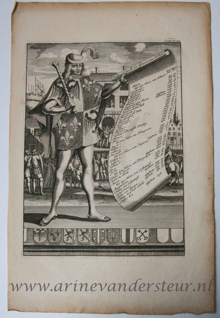 | Bijzonderheden: | A medieval messenger, a herald, holds a roll with an inscription. At bottom some coat of arms.Inscription top right: 'I. Volume Fol: 372.' Inscription at the top right on the scroll: 'Name rolle der Graaven van Holland.' On the roll, 38 names of t... |