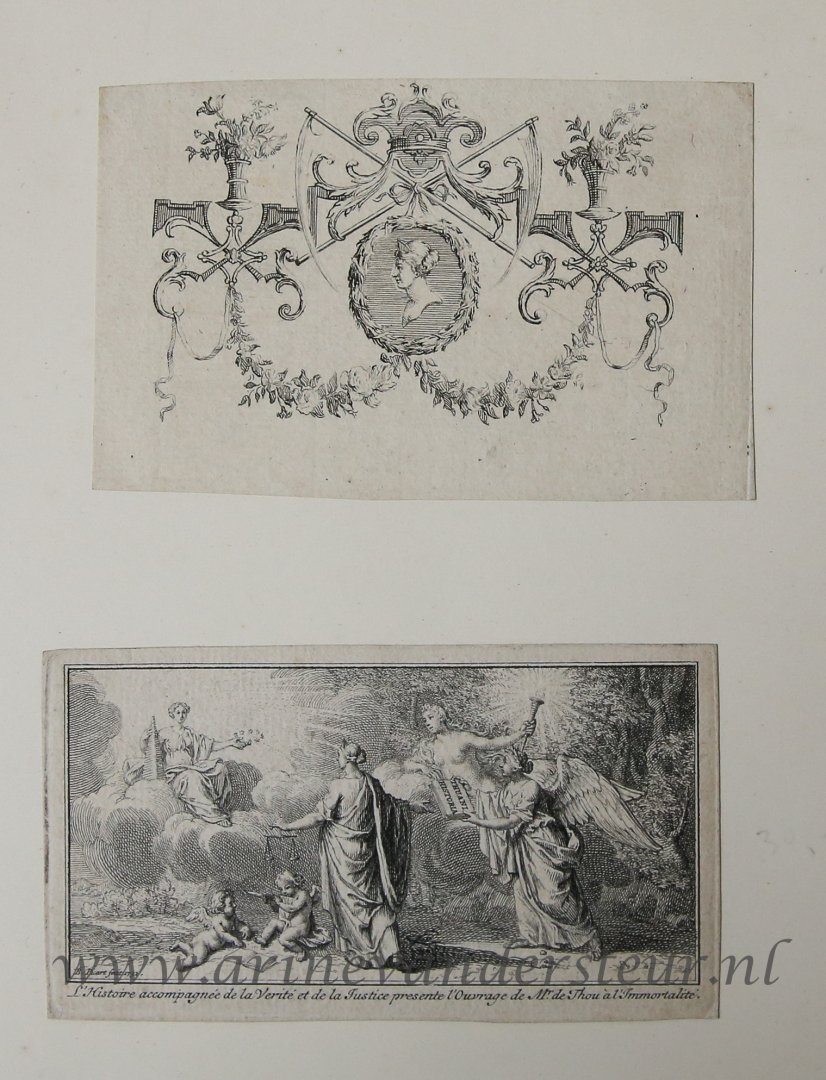 | Bijzonderheden: | Two vignettes mounted on cardboard. Two works by Bernard Picart.The first vignette depicts a profile of a woman within a laurel wreath surrounded by other geometrical decorations.The second vignette shows History, accompanied by Justice and Truth,... |
