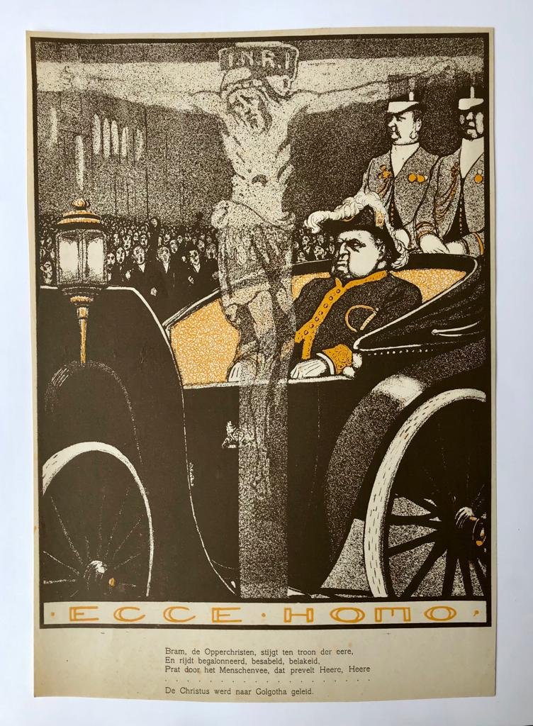 | Titel: | [Original lithograph/lithografie by A. Hahn] Onder Zwart Regime: 12 karikatuur-teekeningen, Bram, de Opperchristen, stijgt ten troon der eere, (...), Amsterdam, 1905, 1 pp. |