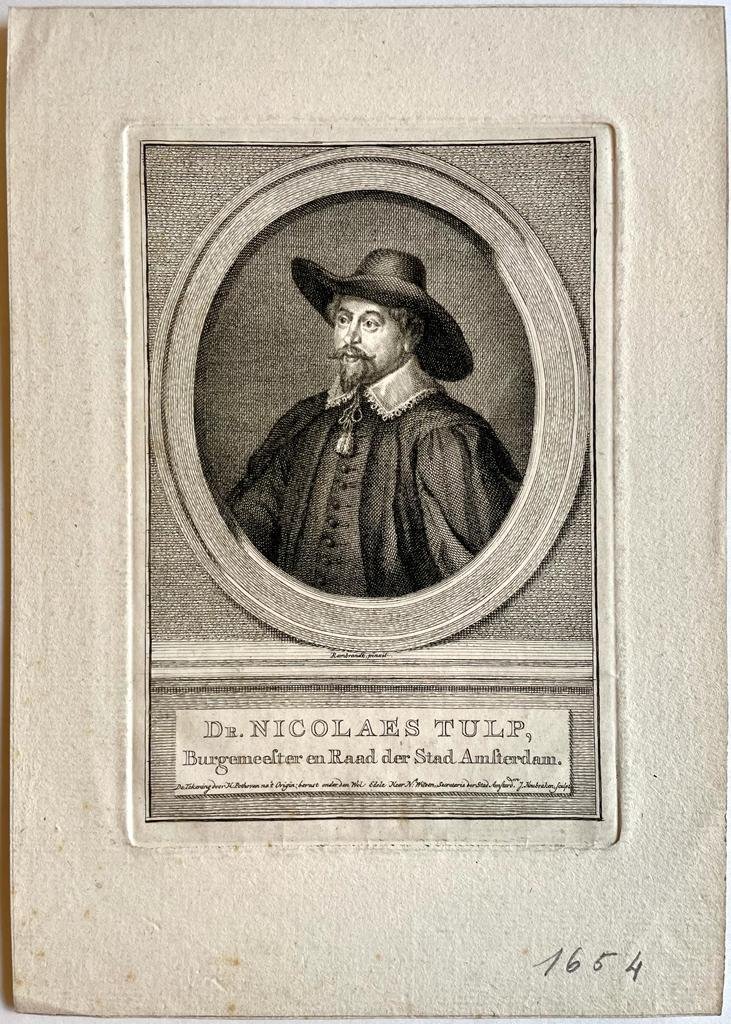 | Titel: | Original print, ca 1760 I Portret van Nicolaes Tulp, dokter en burgemeester der stad Amsterdam, door Houbraken naar Pothoven, Rembrandt 1760. |