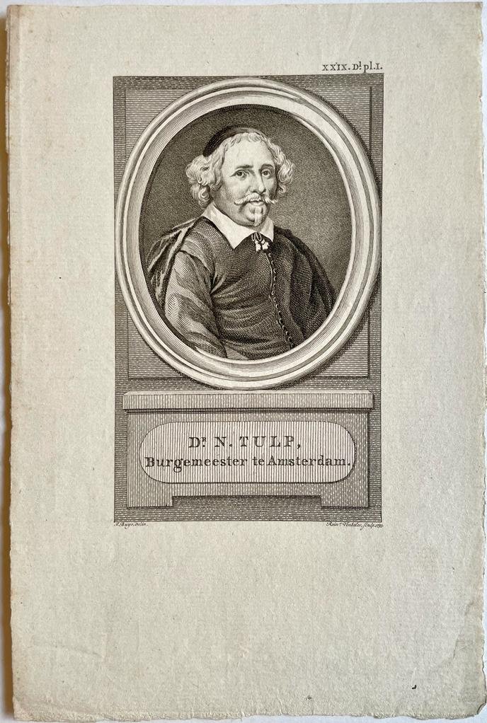 | Titel: | Original print, ca 1793 I Portret van Nicolaes Tulp (1593-1674), dokter en burgemeester der stad Amsterdam, door Reinier Vinkeles naar Buys 1793. |