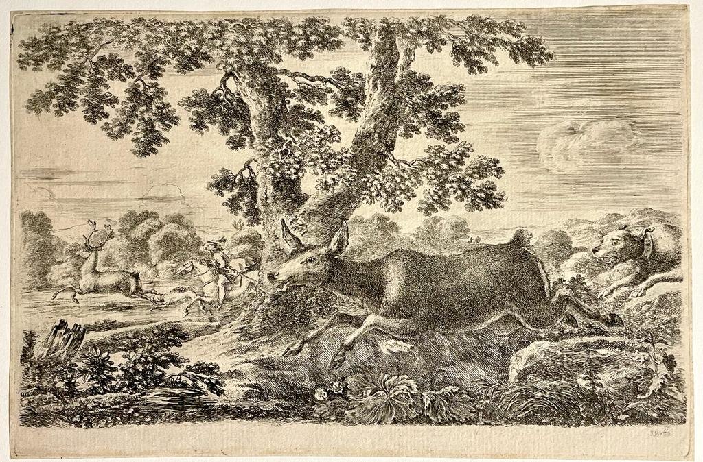 | Bijzonderheden: | Deer hunt; a deer running towards left, chased by a dog, with a large oak tree behind at centre and a stag pursued by a huntsman on horseback and two dogs behind to left.Fourth from a set of nine prints without plate numbers or frontispiece. There... |