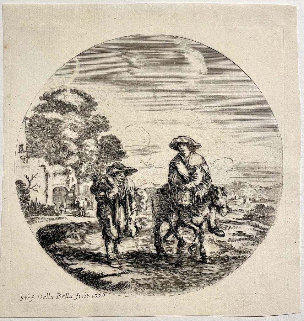 | Titel: | Antique print, Della Bella | Two peasants travelling (Twee reizende boeren), published 1656, 1 p. |