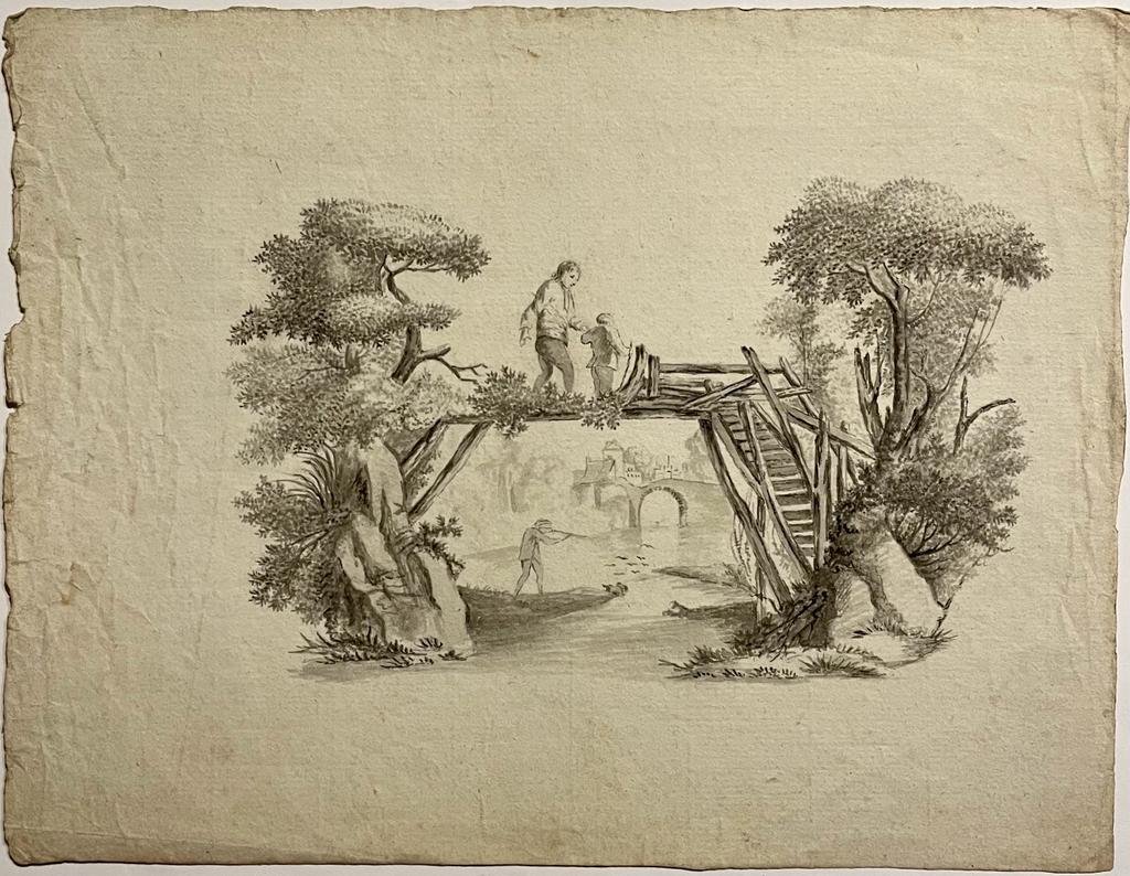 | Bijzonderheden: | A small wooden bridge over a stream, flanked by trees. Walking on the bridge a man with a child. A hunter under the bridge. On the far background another brick bridge with a village beyond. Unsigned drawing. Probably after a printed vignette.[NL] ... |