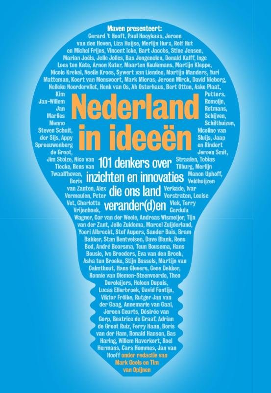 Nederland in ideeën het eerste boek van een serie waarin we elk jaar rond de 100 toonaangevende Nederlandse denkers vragen om kort en krachtig (max 1000 woorden) antwoord te geven op één centrale vraag. De vraag wisselt jaarlijks en zal altijd betrekking hebben op het raakvlak van wetenschap en maatschappij. Dit jaar was de vraag: 'Welk idee, inzicht of innovatie heeft Nederland veranderd - of zal dit in de toekomst gaan doen?'\n\nBeatrice de Graaf (veiligheid), Jeroen Smit (journalistiek), Gerard 't Hooft (natuurkunde), Henk van Os (kunstgeschiedenis), Neelie Kroes (technologie), Boris van der Ham (filosofie), Heleen Dupuis (ethiek), Nelleke Noordervliet (literatuur), Stine Jensen (filosofie) en 92 andere invloedrijke wetenschappers, auteurs en kunstenaars schrijven over de fiets, de pil, het feminisme, Big Brother, gentherapie, de flitspaal, sociale robots, kweekvlees, absurdistische cinema, kwantummechanica en 91 andere ideeën, inzichten en innovaties die Nederland hebben veranderd, of dit in de toekomst gaan doen.