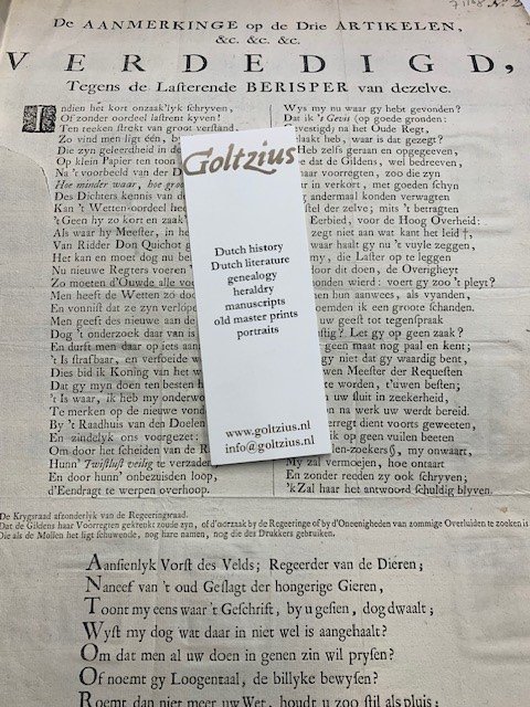 De aanmerkinge op de drie artikelen, &c. &c. &c. verdedigd, tegens de lasterende berisper van dezelve Amsterdam, Gerrit Vlier de Jonge, [1748], one large page, 39x29cm, some soiling, edges frayed, bottom cut short, tears in margins. Pamphlet signed by J.V.G. and written in the unruly year 1748 when Dutch citizens turned against the elite and demanded fairer taxation and more help from stadhouder Willem IV. Petit 6480. Scarce. According to Worldcat not in any library. Not in KB.