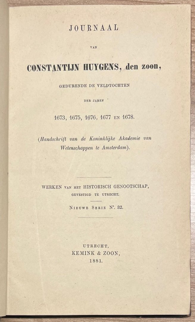 | Titel: | Printed publication, 1881, Huygens | Journaal van Constantijn Huygens, den zoon, gedurende de veldtochten der jaren 1673, 1675, 1677 en 1678, Utrecht, Kemink en Zoon, 1881, 276 +(2) pp. |