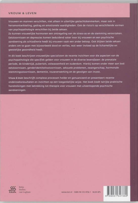 De risico’s op verschillende vormen van psychopathologie verschillen bij beide seksen. Eetstoornissen en depressies komen bijvoorbeeld vaker bij vrouwen voor. Vrouwelijke specialisten beschrijven in het boek de prevalentie, het beloop en de behandeling van die aspecten van de psychopathologie die specifiek gelden voor vrouwen.