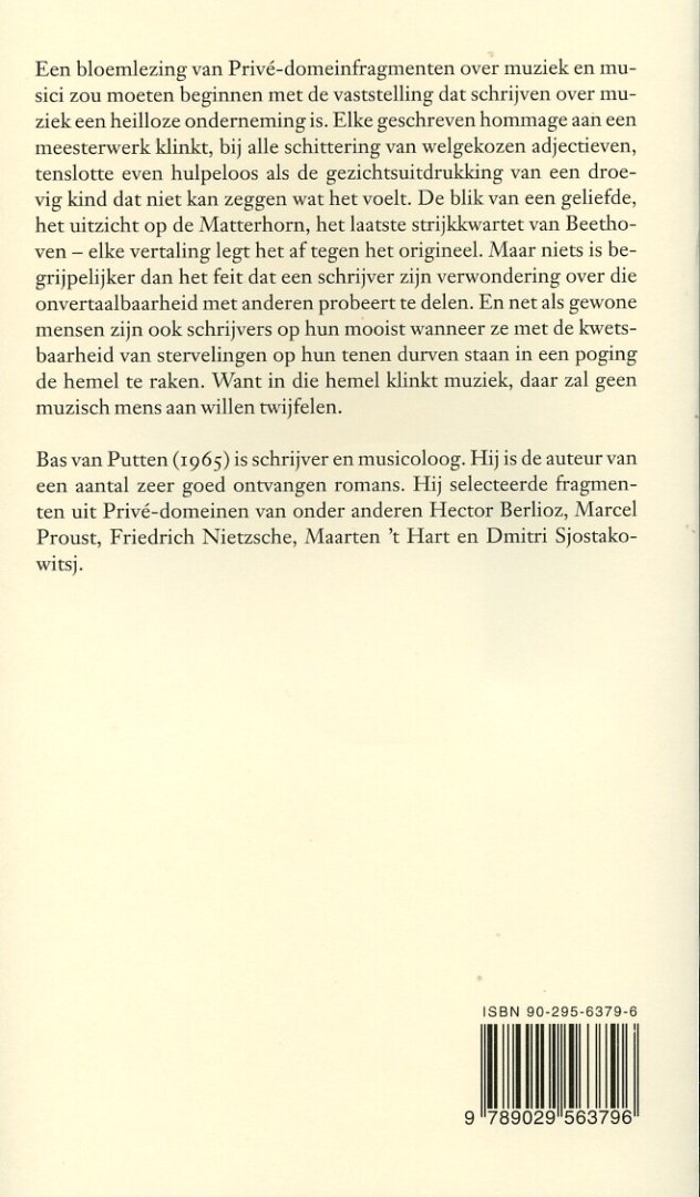 Een bloemlezing van Privé-domeinfragmenten over muziek en musici zou moeten beginnen met de vaststelling dat schrijven over muziek een heilloze onderneming is. Elke geschreven hommage aan een meesterwerk klinkt, bij alle schittering van welgekozen adjectieven, tenslotte even hulpeloos als de gezichtsuitdrukking van een droevig kind dat niet kan zeggen wat het voelt. De blik van een geliefde, het uitzicht op de Matterhorn, het laatste strijkkwartet van Beethoven - elke vertaling legt het af tegen het origineel. Maar niets is begrijpelijker dan het feit dat een schrijver zijn verwondering over die onvertaalbaarheid met anderen probeert te delen. En net als gewone mensen zijn ook schrijvers op hun mooist wanneer ze met de kwetsbaarheid van stervelingen op hun tenen durven staan in een poging de hemel te raken. Want in die hemel klinkt muziek, daar zal geen muzisch mens aan willen twijfelen.