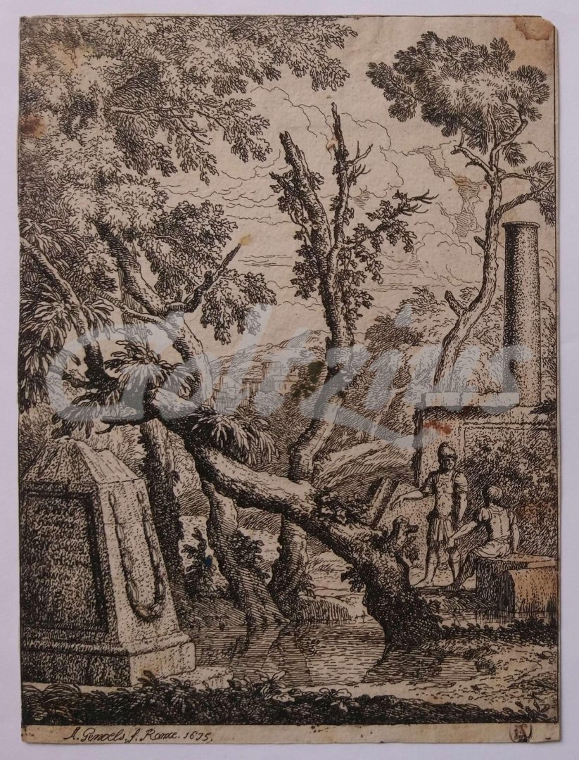 Two soldiers near a ruin Two soldiers, one standing, the other seated on a boulder, in a ruined building with trees and a pond. Etching on hand laid paper, made by Abraham Genoels, after his own design. Dated 1675, Rome. Sheet size 141 x 192 mm. Abraham Genoels (nickname: Archimedes) (Antwerp 1640 - 1723 Antwerp) was a Flemish Baroque painter, printmaker, draughtsperson, and tapestry designer. He is mainly remembered for his landscape paintings and prints. He worked in many places in Europe, including Paris, Rome and Antwerp. A beautiful print, but not in the best condition. Cropped within platemark, a small stain in the top right corner, some minimal paper loss top right, a a small stain in the center of the image, and another above the head of the standing soldier, some soiling in the left edge. References: Hollstein 18 (only state); Bartsch 18. With the collection mark of Friedrich August II of Saxony (Lugt 971) in the lower edge.