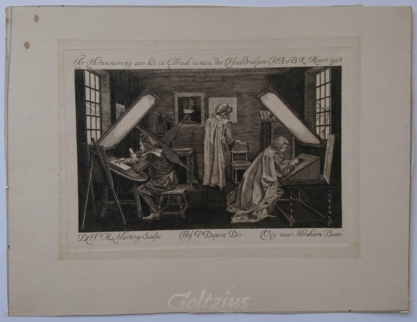 Printmakers and printing room Two printmaker's benches in the foreground, and a printing press in the background. Wtih three figures working. This print was published to commemorate the opening of the printing press at the Rijksacademie voor Beeldende Kunsten (where the artist of this print had his training). Etching on laid paper, sheet size 215 x 184 mm., platemark 140 x 201 mm. Made by Dirk Harting, under supervision of Pieter Dupont, freely after Abraham Bosse. Dirk Harting (Salatiga 1884-1970 Haarlem) was a Dutch graphic artist, painter, draughtsperson, and print collector, born in Indonesia. His training was at the Rijksacademie van Beeldende Kunsten in Amsterdam, where he was a student of Pieter Dupont and Willem Witsen, both accomplished artists and etchers. Pieter Dupont (Amsterdam 1870-1911 Hilversum) was an important Dutch graphic artist, best known for his depictions of work horses. He was a teacher at the Drawing School for Craftmanship (1891-1896) and in 1902 became professor of graphic art at the Rijksakademie in Amsterdam. Abraham Bosse (Tours c. 1604-1676 Paris) was a French designer, etcher, draughtsperson, painter, and art theorist. He wrote several tracts on printmaking and perspective. In good condition. Image area a little discoloured, verso overall browned (both from previous acidic matting). Two small stains in the top left margin corner.
