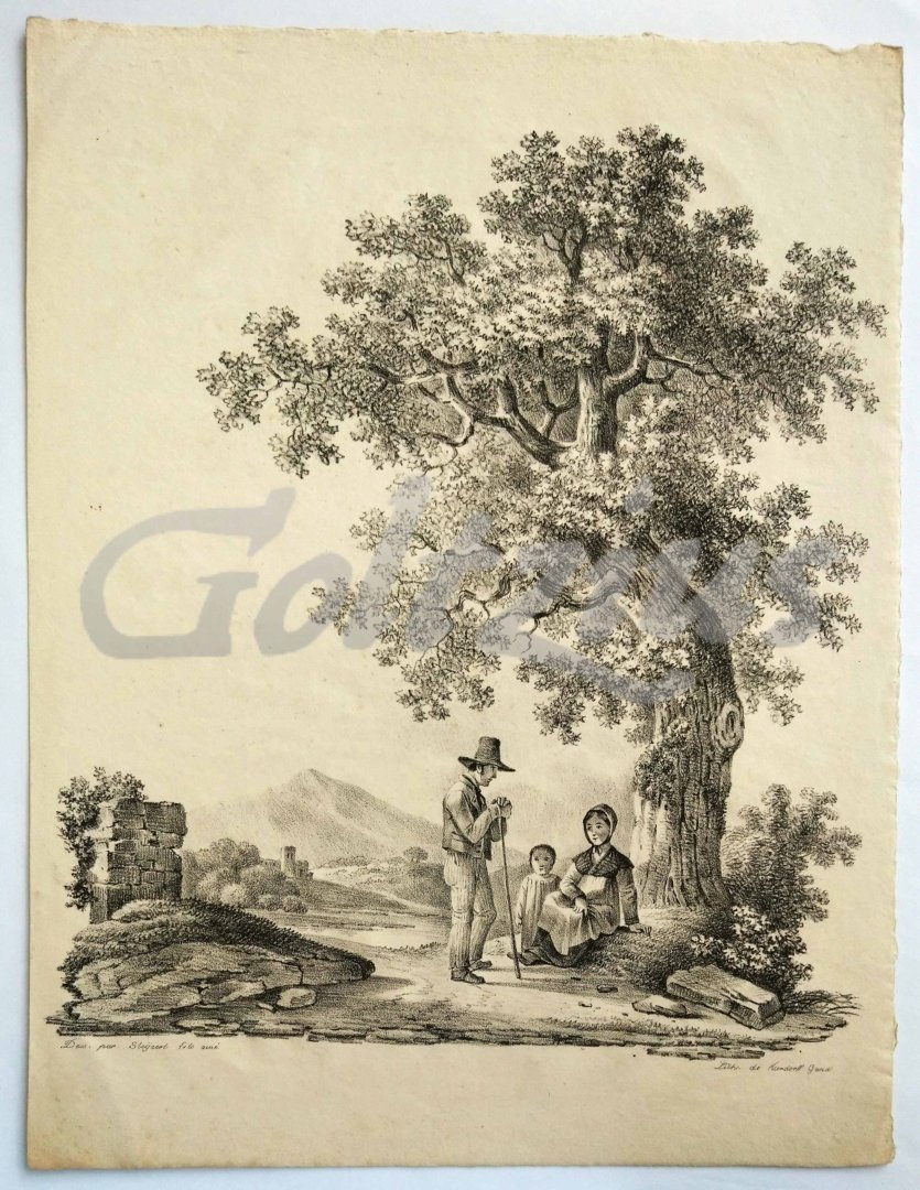 Landscape with family Early lithograph of a family of three resting in the shade of a tree, with a castle in front of a mountain in the background. Lithograph on wove paper, sheet size 233 x 304 mm. Made by Franciscus Kierdorff after the design of Steijaert fils (probably Anton Pierre Steyaert), published in Ghent, c. 1827. Franciscus Mattheus Jozef Kierdorff (Trier 1777-1855 The Hague) was a German-born lithographer and printmaker. He founded a lithographic printing firm in Ghent in 1826. In very good condition, the sheet edges minimally browned, and some faint creasing in the top left corner. References: Thieme Becker XX 271.