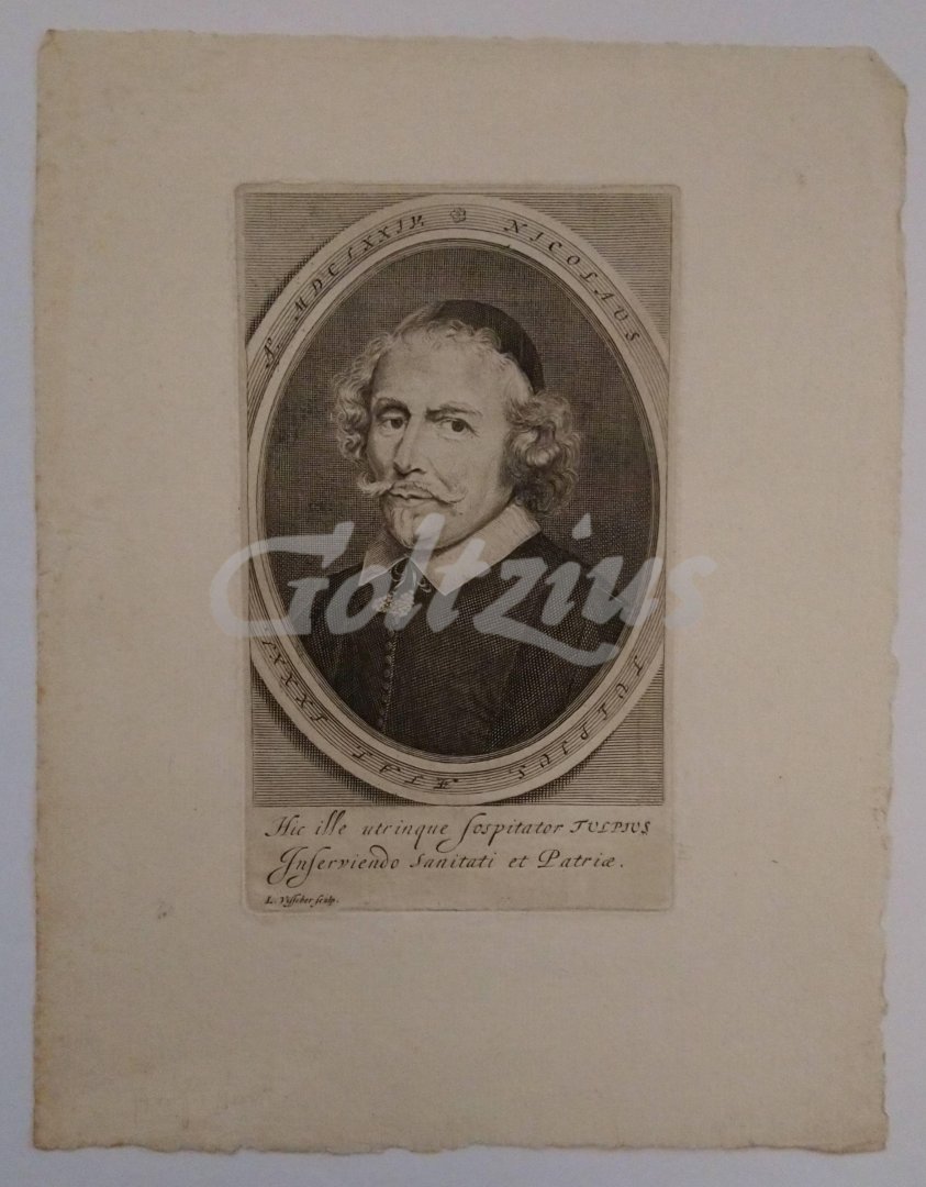 Portrait of Nicolaes Tulp Bust-length portrait of Nicolaes Tulp (Amsterdam 1593 - 1674), one of the most famous medical doctors of the 17th century, and burgomaster of Amsterdam. Engraving with stipple work, on hand laid paper, sheet size 214 x 167 mm., platemark 140 x 85 mm. Made by Lambert Visscher (Haarlem 1631/3 - 1690 Italy), a Dutch printmaker and draughtsperson, brother of Johannes Visscher and Cornelis II Visscher. Two diagonal creases in the margins, a tiny hole just left of the platemark, lower left. Otherwise fine. References: Hollstein 40 (iv/4); Le Blanc IV p.138: 18 (iv/4); Muller Portraits 5486; Van Someren p.633