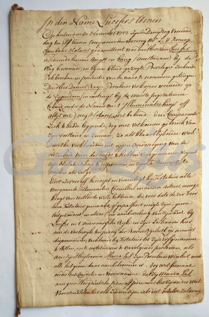 Manuscript mock testament for Daniël Raap Seven page anonymous manuscript so-called testament for Daniël Raap, opening with the line: "In den Name Lucifers Amen" (In the name of Lucifer, amen) immediately identifying the content as satirical. The location is identified as "voor den Hove van Lucifer residerende binnen Angst en Bang (Amsterdam)": before the Court of Lucifer, in residence within Fear and Scared (Amsterdam). Brown ink on laid paper, around 30 lines per page, two sheets bound with simple cord bindings in the top and lower edges, sheet size (open) 422 x 333 mm. Watermarks in both sheets: "JH & Zoon" and a "pro patria eiusque libertate', showing a lion rampant on a pedestal with 'Vryheyt' (freedom) on it. These watermarks from Jan Honig & Zoon date to c. 1730-1780. The text is identical to the printed text of "Testament of Uyterste Wille van den Heere Daniel Raap" (see: Rijksmuseum Amsterdam RP-P-OB-84.473). The testament itself is dated 20 November 1753, while the published version is dated 1754, the year of death of Daniël Raap. This is probably a contemporary copy (or 'afschrift'). Daniël Raap (Amsterdam 1703-1754) was a Dutch porcelain merchant who played a leading role during the Orangist revolution in the Netherlands of 1747-1751. Although he was initially revered by the people of Amsterdam, his popularity had turned by the time he died. Riots broke out during his funeral procession, and his coffin was destroyed. In good condition, used to be folded twice (creases visible), some small imperfections in the sheet edges but generally clean.