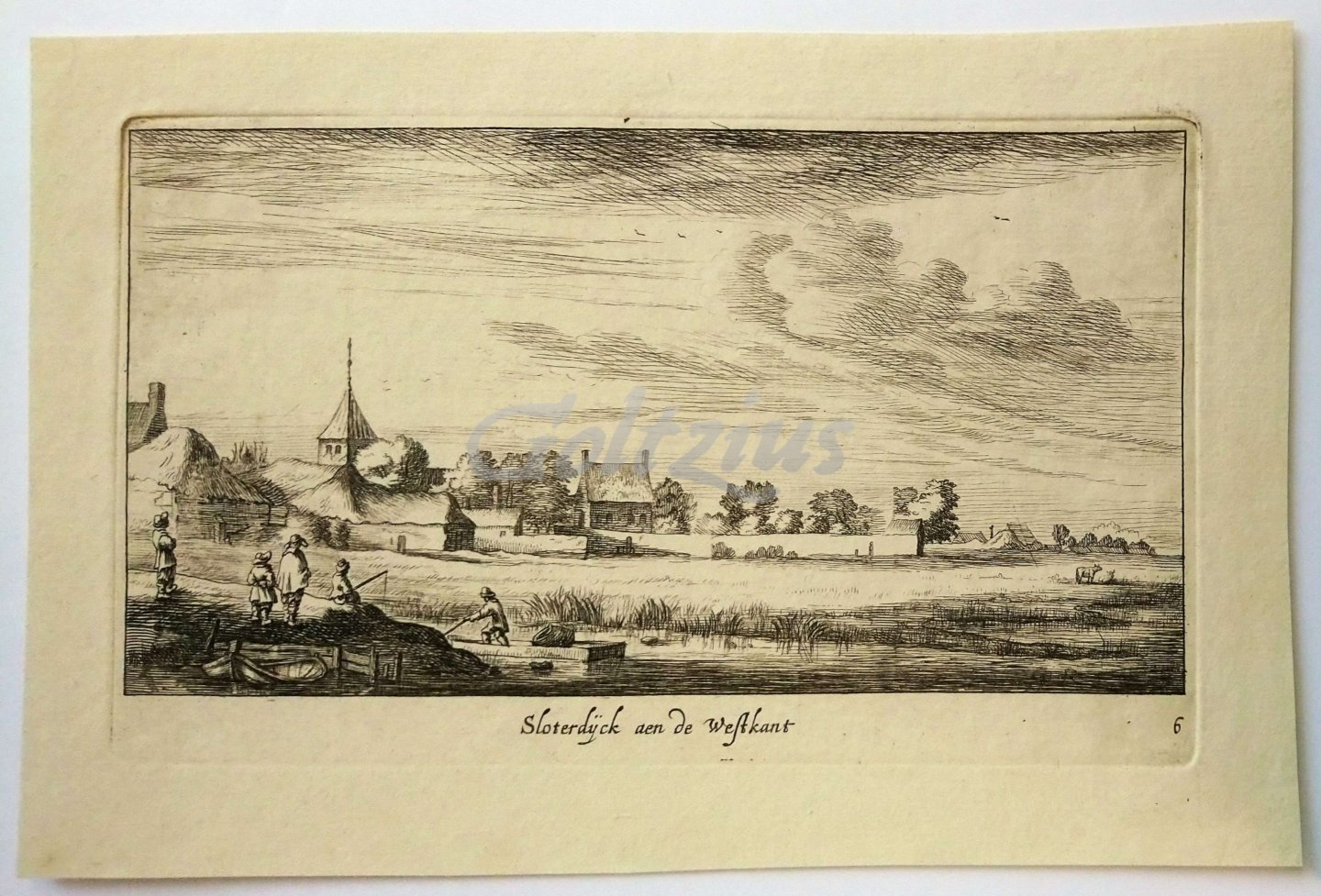 Sloterdijck aen de Westkant A view of Sloterdijk, near Amsterdam, from the west. Print no. 6 from the series 'Plaisante Lantschappen'. Etching on laid paper, sheet size 260 x 171 mm., platemark 223 x 133 mm. Made by Geertruyd Roghman, after Roelant Roghman and published by Claes Jansz. Visscher (II), c. 1640. Geertruyd Roghman (Amsterdam 1625-1657 Amsterdam) was a Dutch printmaker, painter and draughtsperson. She was the oldest sister of Roelant Roghman (Amsterdam 1627-1692 Amsterdam), another Dutch painter and printmaker. In excellent condition, fresh and with ample margins. References: Hollstein 14 (only state); Bartsch 6; Wurzbach 14.