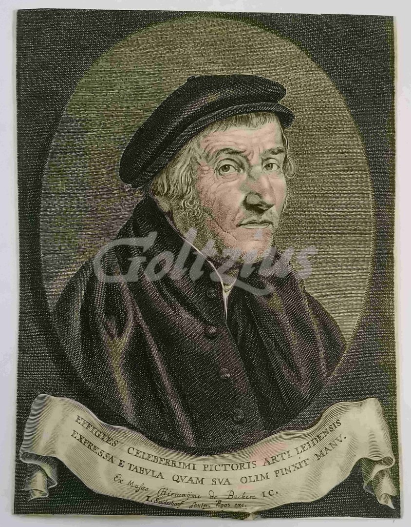 Portrait of Aert van der Leyden Bust-length portrait after the self-portrait of painter Aertgen Claesz. van Leyden. Engraving on hand laid paper, sheet size 213 x 163 mm. Made by Jonas Suyderhoef after Aertgen Claesz. van Leyden and published by Pieter Goos, ca. 1660 in Amsterdam. Jonas Suyderhoef (Haarlem 1614-1686) was a Dutch printmaker and etcher. Aertgen Claesz. van Leyden (Leiden 1498-1564) was a Dutch painter and draughtsperson. Pieter Goos (Amsterdam 1615/16-1672) was a Dutch cartographer, publisher and printmaker. In good condition, cropped within platemark. Minimal surface damage in the lower edge. Both sides and the lower edge backed with contemporary paper. References: Hollstein p. 226: 58; Dutuit 1; Wussin 1; Muller 6341.