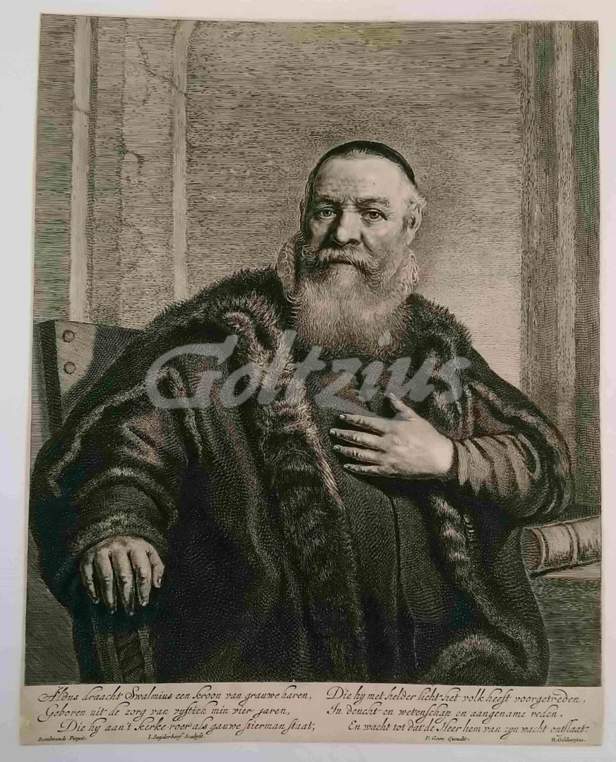 Portrait of Eleazar Swalmius Half-length portrait of preacher Eleazar Swalmius, with a six-line caption in Dutch by H. Geldorpius. Engraving on hand laid paper, sheet size 328 x 259 mm. Made by Jonas Suyderhoef after Rembrandt van Rijn, and published by Pieter Goos, ca. 1660 in Amsterdam. Jonas Suyderhoef (Haarlem 1614-1686) was a Dutch printmaker and etcher. Pieter Goos (Amsterdam 1615/16-1672) was a Dutch cartographer, publisher and printmaker. In very good condition, cropped within platemark. A minimal spot of paper damage in the lower left of the caption. References: Hollstein p. 252-253: 120 (i/3); Wussin p. 51:85; Muller p. 249: 5217c.