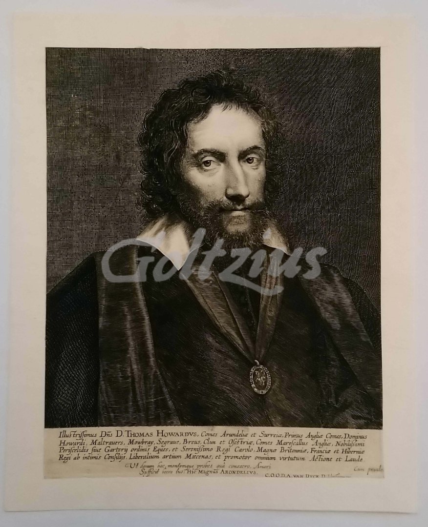 Portrait of Thomas Howard, Earl of Arundel Bust-length portrait of Thomas Howard, an English peer, diplomat and courtier during the reigns of King James I and King Charles I, but he made his name as a Grand Tourist and art collector rather than as a politician. When he died he possessed 700 paintings, along with large collections of sculptures, books, prints, drawings, and antique jewellery. Most of his collection of marble carvings, known as the Arundel marbles, was eventually left to the University of Oxford (source: Wikipedia). Engraving on hand laid paper, sheet size 251 x 196 mm., carrier 290 x 237 mm. Made by Lucas I Vorsterman, after the portrait by Anthony van Dyck, c. 1620-1640. Lucas I Vorsterman (Zaltbommel 1595/96 - 1674/75 Antwerp) was a Dutch printmaker, draughtsperson, engraver and publisher. Anthony van Dyck (Antwerp 1599 - Blackfriars 1641) was a Dutch painter, draughtsperson, printmaker and collector. He travelled widely in Italy, France and England, and became court painter in England and was elevated to nobility in 1632. Van Dyck also made an engraving of a portrait of Vorsterman. In good condition, cropped within platemark (possible minimal loss of image), attached to thick carrier sheet. Some small nicks in the lower edge (not affecting image of text). References: Hollstein p. 128-129: 132 (iii/3); New Hollstein vol. 3, p. 14: 109 (iii/3); Dutuit 201; LeBlanc 53; O'Donnell 11