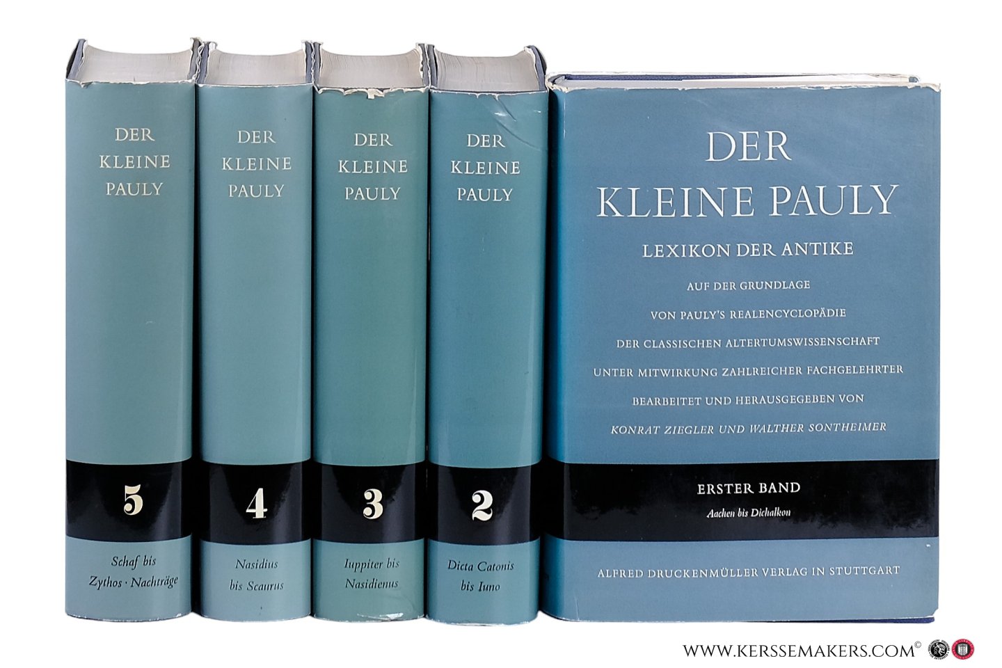 23 cm. - (dust-jackets slightly damaged at edges) Very good, see pictures ¶ Vol 1: Aachen bis Dichalkon. xxvi,780,viii pp. printed in 2 columns. Vol 2: Dicta Catonis bis Iuno. iv,792viii pp. printed in 2 columns. Vol 3: Iuppiter bis Nasidienus. iv,790,viii pp. printed in 2 columns. Vol 4: Nasidius bis Scaurus. iv,794,vi pp. printed in 2 columns. Vol 5: Schaf bis Zythos - Nachträge. vi,826,xxii pp. printed in 2 columns.