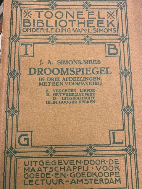 Droomspiegel in drie afdeelingen met een voorwoord. Amsterdam, Maatschappij voor goede en goedkoope lectuur, tooneelbibliotheek onder leiding van L. Simons, 1920, 67pp. loose second titlepage, original softcover paper binding. Original play written by J.A. Simons-Mees, cooperation of Leo Simons (1862-1932).
