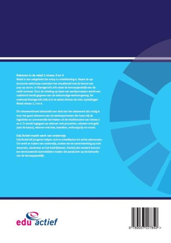 Retail is een vakgebied dat volop in ontwikkeling is. Naast de opkomende webshops verandert het straatbeeld met de komst van pop-up stores. In Klantgericht.info staat de beroepspraktijk van de retail centraal. Door de indeling op basis van werkprocessen wordt een realistisch beeld gegeven van de toekomstige werkomgeving. De methode Klantgericht.info is in te zetten binnen de mbo-opleidingen Retail niveau 2, 3 en 4.Dit rekenwerkboek behandelt een deel van het rekenwerk dat nodig is voor het goed uitvoeren van de werkzaamheden die horen bij de logistieke en commerciële kerntaken uit de retaildossiers van niveau 3 en 4. Er wordt ingegaan op rekenen met procenten, rekenen met geld (aan de kassa), rekenen met btw, bestellen, verkoopprijs en omzet.
