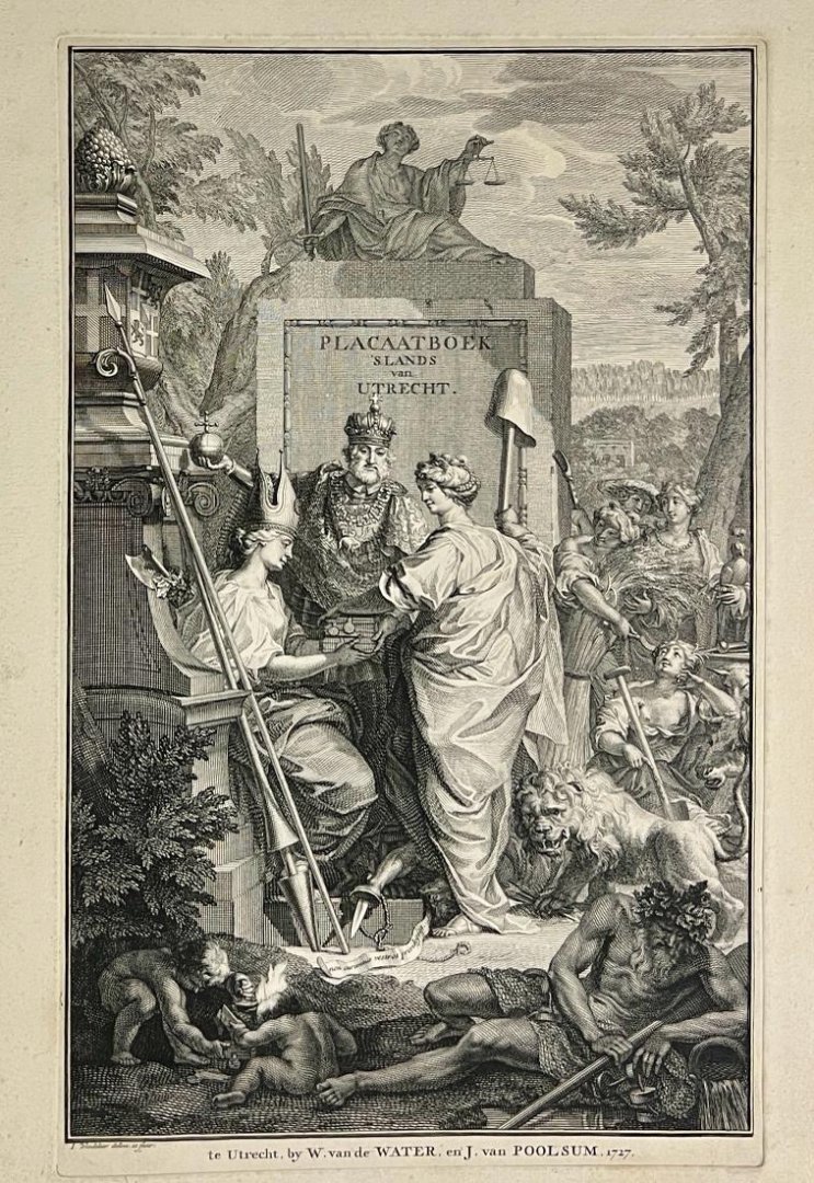 | Titel: | Antique print, engraving | Allegorical frontispiece of PLACAATBOEK 'S LANDS van UTRECHT, published 1727, 1 p. |
