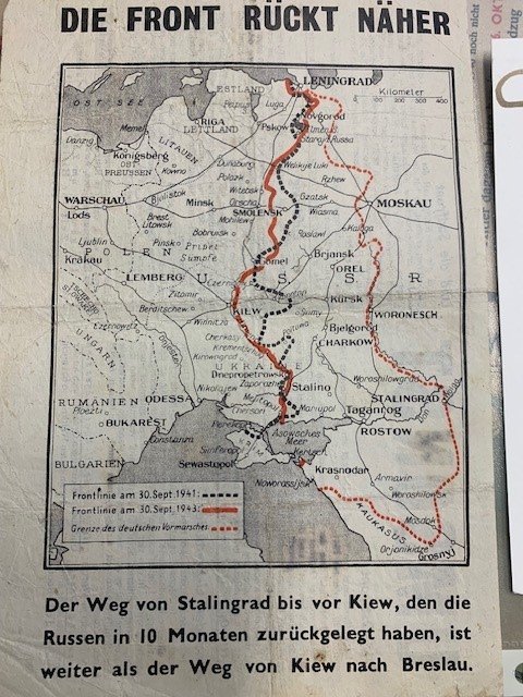 | Meer info: | Die front ruckt naher. Umsinst die Ostfront. Pamflet distributed bu the RAF/USAAF allied airforces. Political Warfare Executive) 1943 G.80, two pages printed propaganda leaflet with map of the eastern front. 21x13cm. not in Imperial War Museum collection. NIOD 3-D5-G100. |