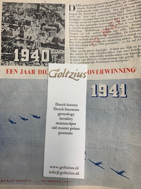 1940-1941 een jaar dichter bij de overwinning London, 717, May 1941, propaganda leaflet dropped by RAF on Netherlands soil. Two pages printed (colour) with illustrations and text in Dutch. Good condition, some wear and tear to edges, small damages. l Een pamflet gedrukt op een wit blad papier met de kleuren rood en blauw. Het pamflet is getiteld: "Een jaar dichter bij de overwinning 1940-1941" en met de opdracht: "De R.A.F. groet U ..... en vergeet niet".