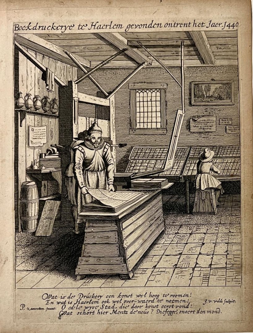 | Titel: | Antique print, etching | The book printer's workshop, published 1628, 1 p. |