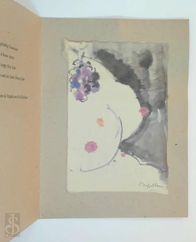 | Meer info: | Claus tekende 3 prenten voor nieuwjaarswensen van restaurant 'De Bellefleur' in Kapellen.\nDe kleurenprenten werden in de plaat gesigneerd 'Hugo Claus' en op een geplooide kartonnen kaart gekleefd.\nKarton beetje gekreukt |
