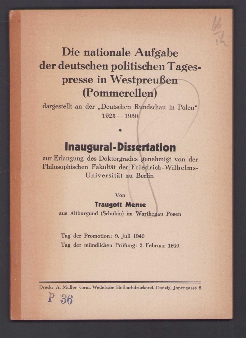 | Titel: | Die nationale Aufgabe der deutschen politischen Tagespresse in Westpreu�en (Pommerellen) dargestellt an der Deutschen Rundschau in Polen 1925-1930 |