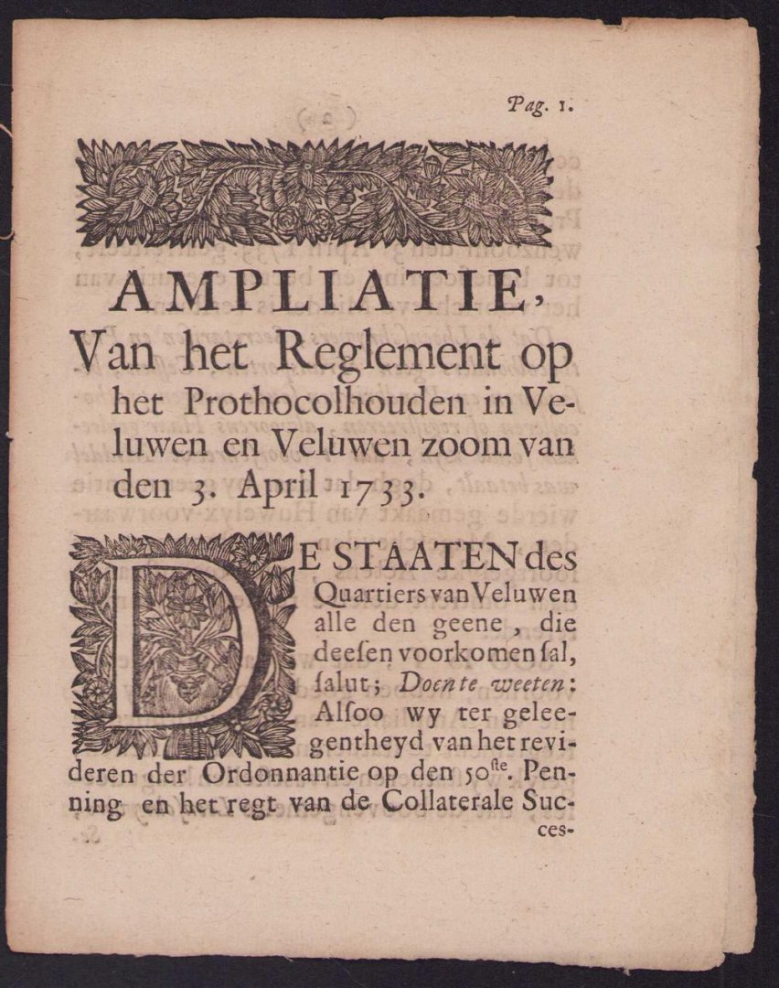 | Titel: | Ampliatie, van het reglement op het prothocolhouden in Veluwen en Veluwen zoom van den 3. April 1733. |