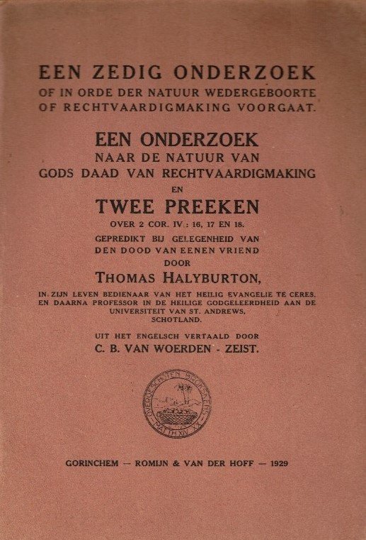 Een onderzoek naar de natuur van Gods daad van rechtvaardigmaking en twee preken over 2 Korinthe 4: 16,17 en 18, gepredikt bij gelegenheid van de dood van een vriend door Thomas Halyburton (1674-1712), in zijn leven bedienaar van het Heilig Evangelie te Ceres, en daarna professor in de Heilige Godgeleerdheid aan de Universiteit van St. Andrews, Schotland. Uit het Engels vertaald door C.B. van Woerden te Zeist. |
