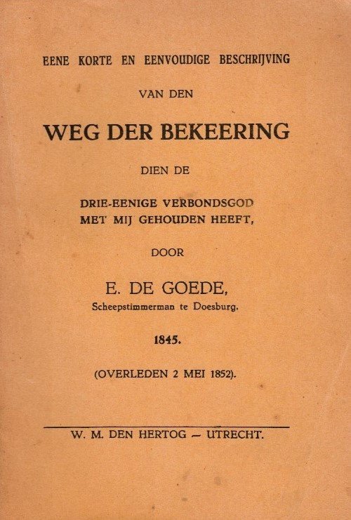 Eene korte en eenvoudige beschrijving van den Weg der Bekeering dien de Drie-eenige Verbondsgod met mij gehouden heeft, door E. de Goede, Scheepstimmerman te Doesburg. 1845, (overleden 2 mei 1852). |