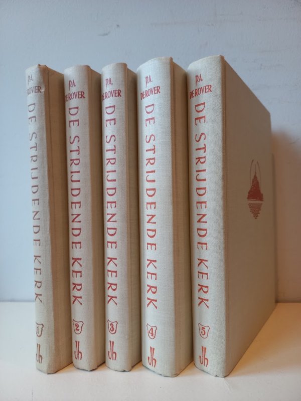 De Strijdende Kerk, vertelling der Kerkgeschiedenis van het eerste Pinksterfeest tot heden door P.A. de Rover. Vijf delen, compleet. Met illustraties. |