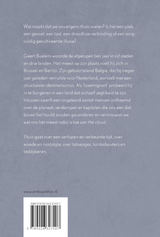 Thuis is de nieuwe poëziebundel van Geert Buelens. In deze gedichten stelt Buelens de vraag wat maakt dat we ons ergens thuis voelen. Is het een plek, een gevoel, een taal, een draadloze verbinding of een zorgvuldig gecultiveerde illusie? Thuis gaat over een verlopen en verbeurde tijd, over woede en nostalgie, over tatoeages, tuinkabouters en teddyberen.Geert Buelens woonde de afgelopen tien jaar in vijf steden en drie landen en is dus de aangewezen persoon om poëzie te schrijven over ontheemding. Zijn eerste dichtbundel Het is werd bekroond met de Lucy B. en C.W. van der Hoogtprijs en genomineerd voor de C. Buddingh’prijs.