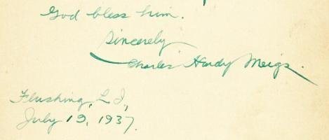Getint papier, mogelijk uit een boek. 16 x 12 cm. In groene inkt. 8 regels, deels een citaat van Zophar (een vriend van Job uit het Oude Testament). 'Souvenir of a happy meeting at Orient Point'. Charles Hardy Meigs, geboren in 1867, was de uitgever van verschillende beroemde miniatuurboekjes en tevens een groot verzamelaar ervan.