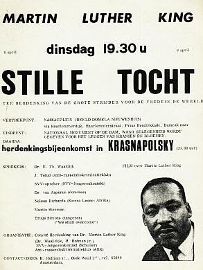 Amsterdam, Comité Herdenking van Dr. Martin Luther King. Poster. 30 x 21 cm. Printed on one side. With a photo. Unfolded and very fine. “Silent Procession in commemoration of the great fighter for peace in the world. Amsterdam, Commemoration Committee for Dr. Martin Luther King.” The Silent March led from the statue of Domela Nieuwenhuis on the Amsterdam Nassauplein to the National Monument on Dam Square, after which a memorial meeting was held in Hotel Krasnapolsky with speakers Eugene Waaldijk, Jacques Tolud, Rev. Van Asperen, Nelson Richards, Martin Sterman and Truus Simons (singer). According to the newspapers, approximately 1,000 people took part in this Silent Protest.