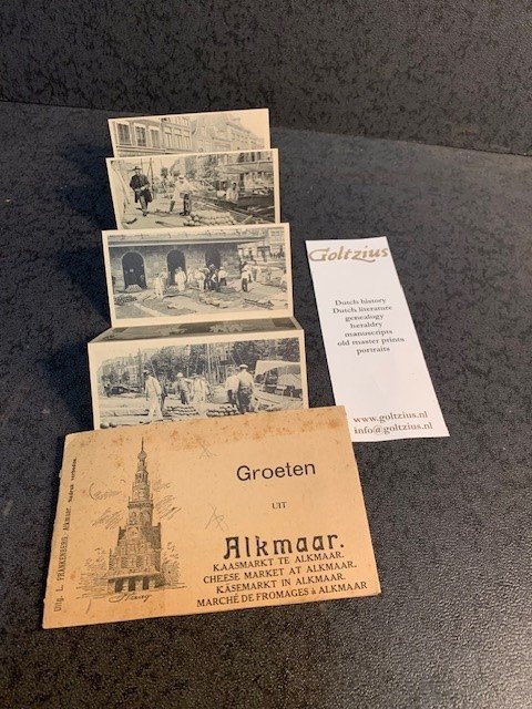 | Meer info: | Groeten uit Alkmaar. Kaasmarkt te Alkmaar. Alkmaar, L. Frankenberg, [1900-1925], 8 views of the famous kaasmarkt in Alkmaar in leparello binding with original illustrated folder. Each plate 5,5x11cm. Showing many men, women and cheese carriers. |
