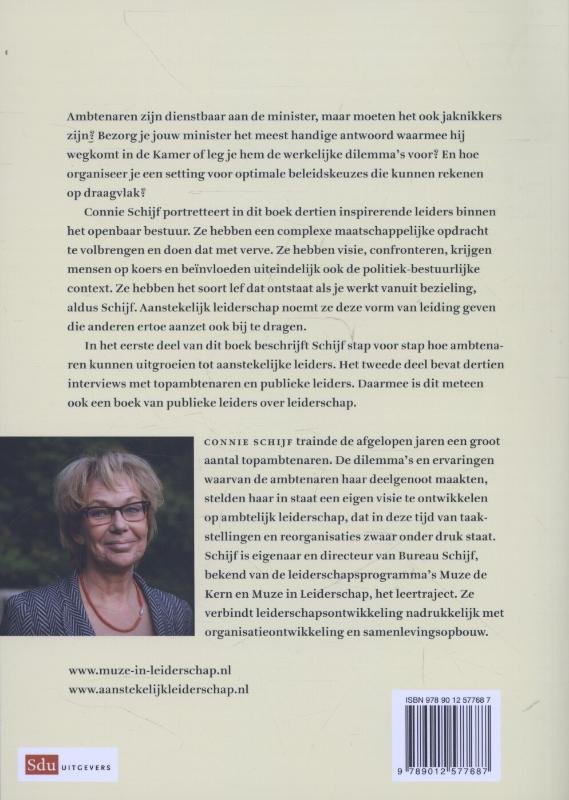 Ambtenaren zijn dienstbaar aan de minister, maar moeten het ook jaknikkerszijn? Bezorg je jouw minister het meest handige antwoord waarmee hijwegkomt in de Kamer of leg je hem de werkelijke dilemma's voor? En hoeorganiseer je een setting voor optimale beleidskeuzes die kunnen rekenenop draagvlak?Connie Schijf portretteert in dit boek dertien inspirerende leiders binnenhet openbaar bestuur. Ze hebben een complexe maatschappelijke opdrachtte volbrengen en doen dat met verve. Ze hebben visie, confronteren, krijgenmensen op koers en beïnvloeden uiteindelijk ook de politiek-bestuurlijkecontext. Ze hebben het soort lef dat ontstaat als je werkt vanuit bezieling,aldus Schijf. Aanstekelijk leiderschap noemt ze deze vorm van leiding gevendie anderen ertoe aanzet ook bij te dragen.In het eerste deel van dit boek beschrijft Schijf stap voor stap hoe ambtenarenkunnen uitgroeien tot aanstekelijke leiders. Het tweede deel bevat dertieninterviews met topambtenaren en publieke leiders. Daarmee is dit meteenook een boek van publieke leiders over leiderschap.Connie Schijf trainde de afgelopen jaren een grootaantal topambtenaren. De dilemma's en ervaringenwaarvan de ambtenaren haar deelgenoot maakten,stelden haar in staat een eigen visie te ontwikkelenop ambtelijk leiderschap, dat in deze tijd van taakstellingenen reorganisaties zwaar onder druk staat.Schijf is eigenaar en directeur van Bureau Schijf,bekend van de leiderschapsprogramma's Muze deKern en Muze in Leiderschap, het leertraject. Zeverbindt leiderschapsontwikkeling nadrukkelijk metorganisatieontwikkeling en samenlevingsopbouw.