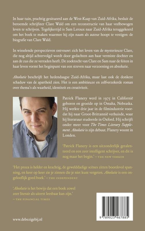 In haar tuin, prachtig gesitueerd aan de West-Kaap van Zuid-Afrika, besluit de beroemde schrijfster Clare Wald om een reconstructie van haar veelbewogen leven te schrijven. Tegelijkertijd is Sam Leroux naar Zuid-Afrika teruggekeerd om het boek te maken waarmee hij zijn naam als auteur hoopt te vestigen: de biografie van Clare Wald.In wisselende perspectieven ontvouwt zich het leven van de mysterieuze Clare, die nog altijd achtervolgd wordt door gedachten aan haar vermiste dochter en aan de zus die ze verraden heeft. De zoektocht van Clare en Sam naar de feiten in haar leven vormt het beginpunt van een streven naar verzoening en absolutie.Absolutie beschrijft het hedendaagse Zuid-Afrika, maar laat ook de donkere schaduw van de apartheid zien. Het is een ambitieuze en zelfverzekerde roman over thema s als waarheid, identiteit en creativiteit.